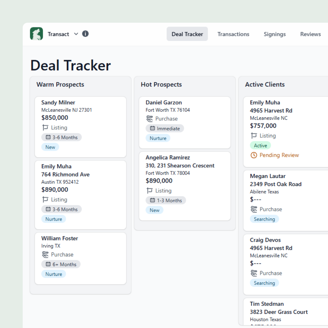 You can't move fast if you're always playing catch-up. Transact's Deal Tracker give you real-time visibility into every stage of the transaction. Track compliance, milestones, and key dates with a clear, step-by-step pipeline view - and launch deals in one click.