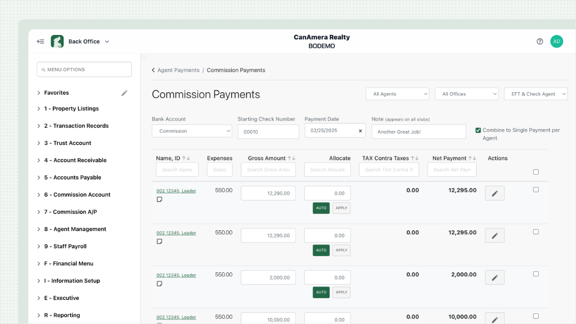 Payroll needs to be accurate, compliant, and easy to manage—whether you’re paying agents, admins, or your entire office staff. Unlike many competitors, Back Office provides full-service payroll support built for both U.S. and Canadian brokerages, including: