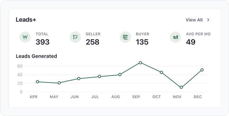 We've launched the Leads+ product widget! This widget provides agents with a concise, real-time overview of their lead generation performance – transforming lead data into a clear, actionable performance summary. It highlights 4 key metrics alongside a 12-month trend chart, giving agents immediate clarity into their pipeline’s health and production patterns.