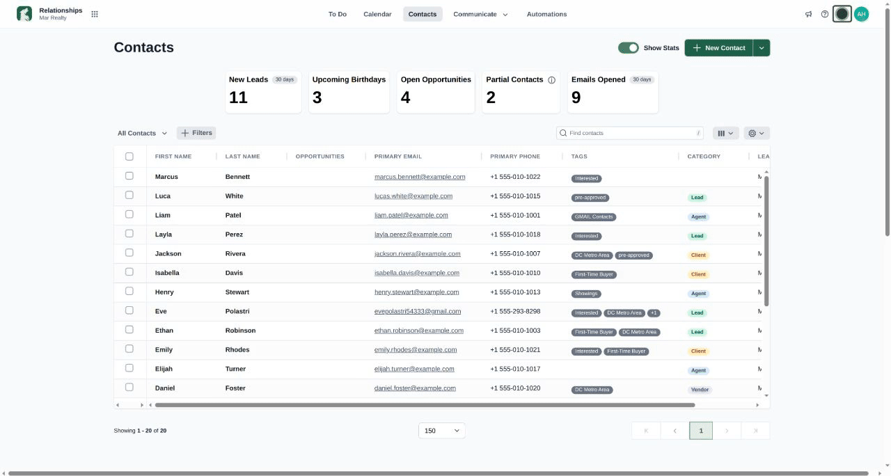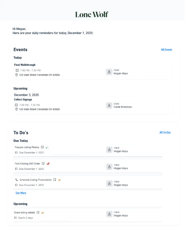 Starting the day with a clear overview of tasks and events helps agents prioritize their schedule, stay organized, and reduce the risk of missed follow-ups.