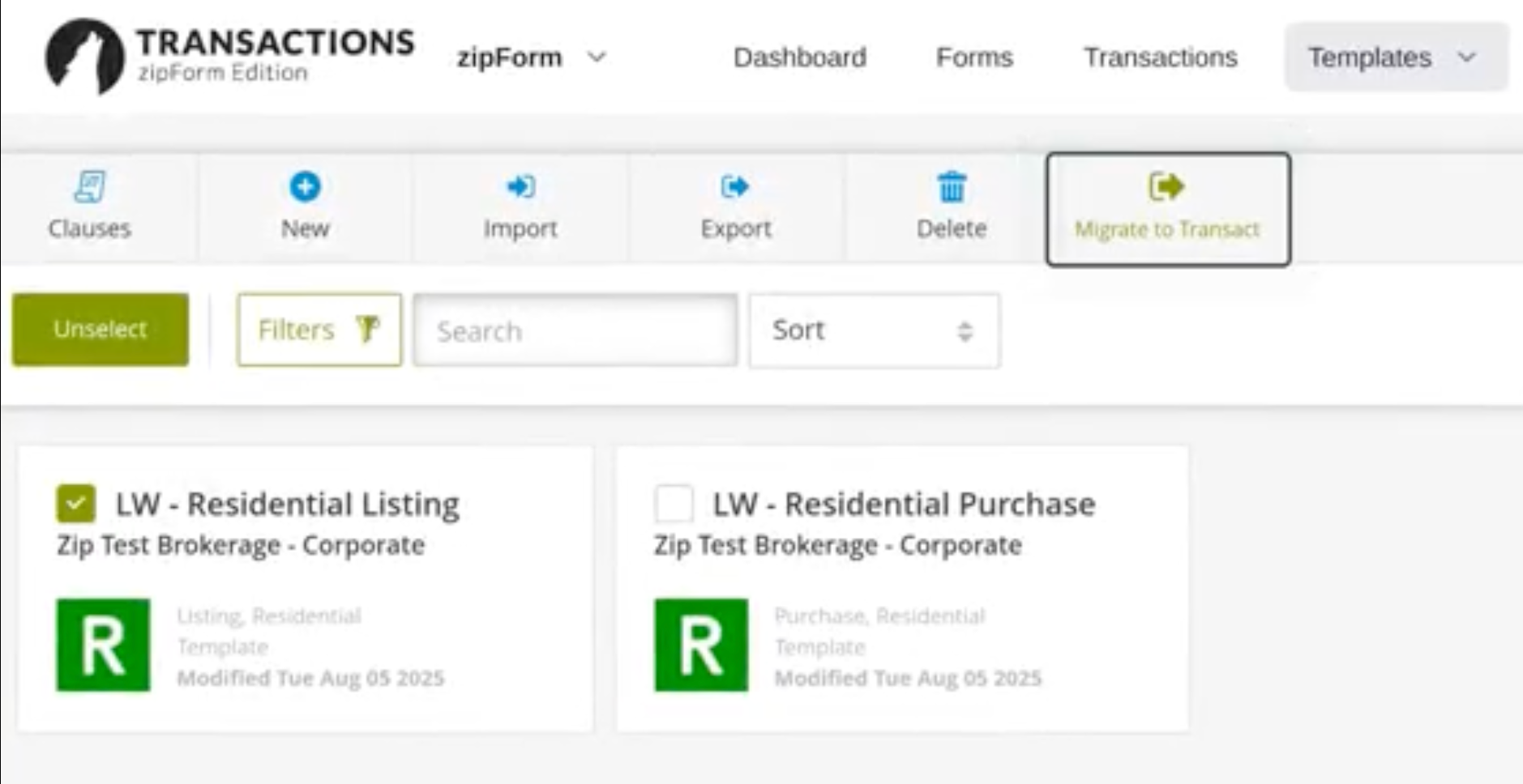 When users claim a Lone Wolf Account, templates previously created in TransactionDesk or zipForm are now automatically migrated into Lone Wolf Transact.